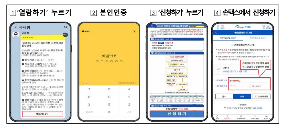 전화 연결한 후 근로장려금을 선택 → 주민등록번호 13자리 입력 후 신청 → 신청안내문(문자메시지)에 적힌 개별인증번호 8자리를 입력 → 안내에 따라 근로장려금 신청완료