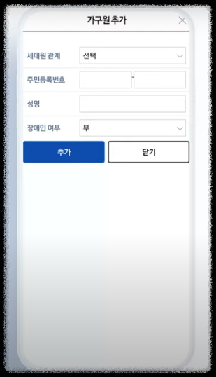 - 가구사항을 입력합니다. 기본으로 입력되어 있는 가구 사항이 사실과 다르면 삭제나 가구원 추가 버튼을 눌러 정정합니다.