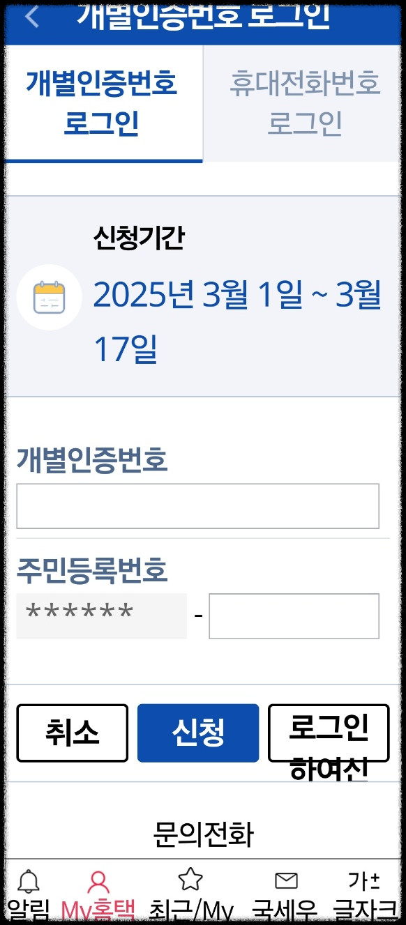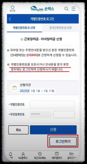 - 손택스에 접속해 신청하기 버튼을 누른 후 로그인 합니다.