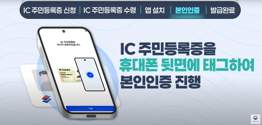 - 수령한 IC 주민등록증을 휴대폰 뒷면에 태그하여 본인인증을 진행합니다.